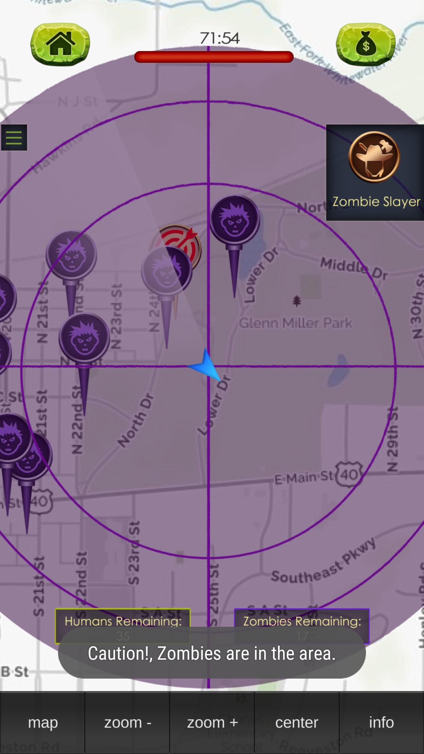 Imagine ficar em pé em uma linha de check -out, parada de ônibus, restaurante ou em qualquer lugar ... quando você recebe "zumbis nas proximidades" Alerta .... pode ser qualquer um ... você corre ... pegue uma "vacina" ... ou execute uma "varredura de zumbis" para identificar sua localização? Este é um jogo de sobrevivência, não apenas mais 1 em um jogo de 100 filmagens. Não se esqueça de ativar sua "casa segura" .... pode estar em qualquer lugar que você escolher ... sua casa, onde você trabalha ou um estacionamento ... porque quando você está dentro dos limites da sua "casa segura" .... nenhum zumbi pode tocar em você !!!